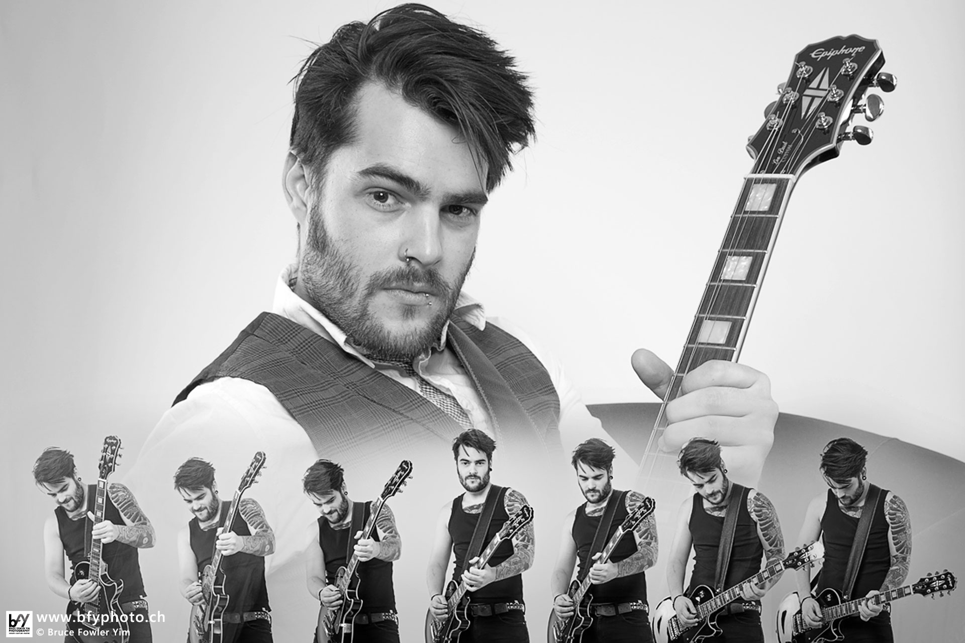 Gitarren Spieler gegen den hellen Hintergrund fotografiert