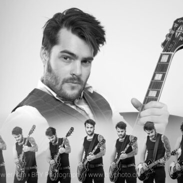 Gitarren Spieler gegen den hellen Hintergrund fotografiert
