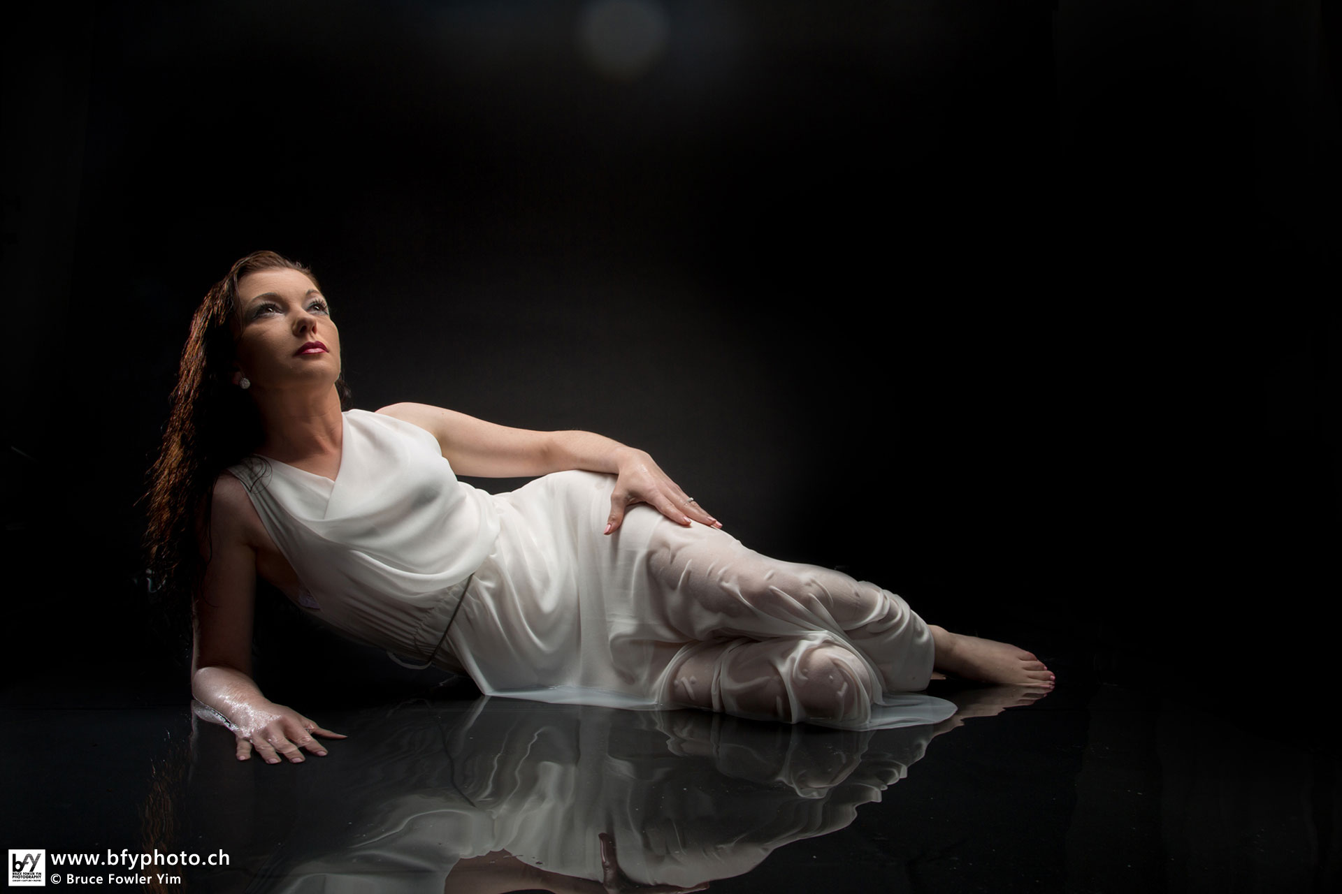 Hübsche Fau mit weissem Dress auf schwarzem Hintergrund